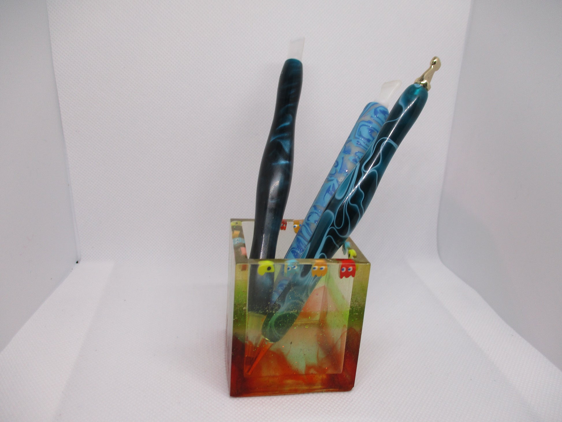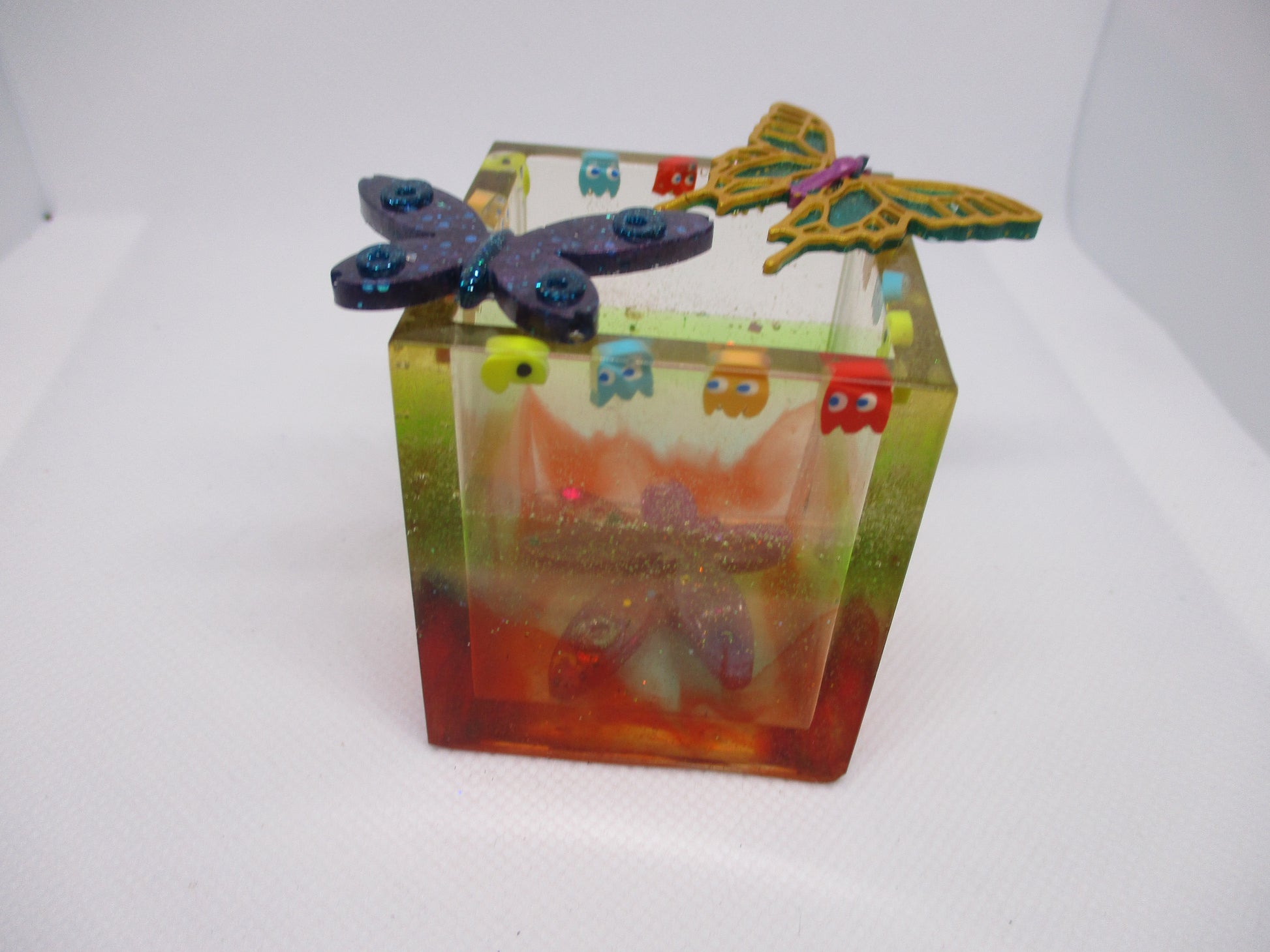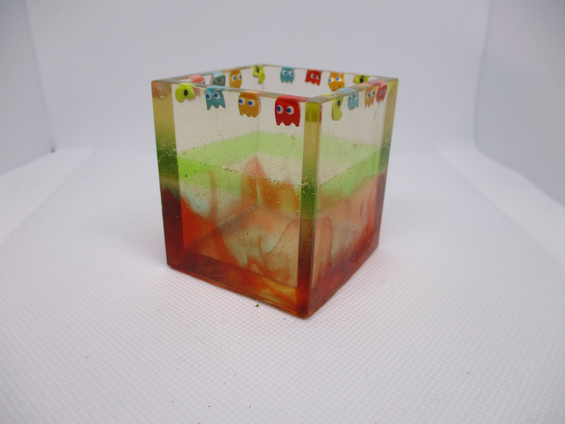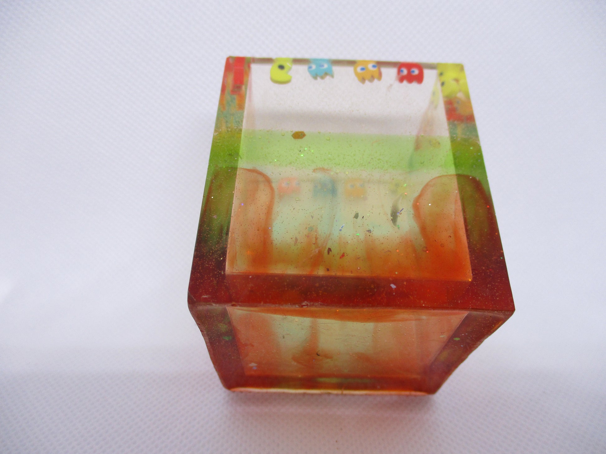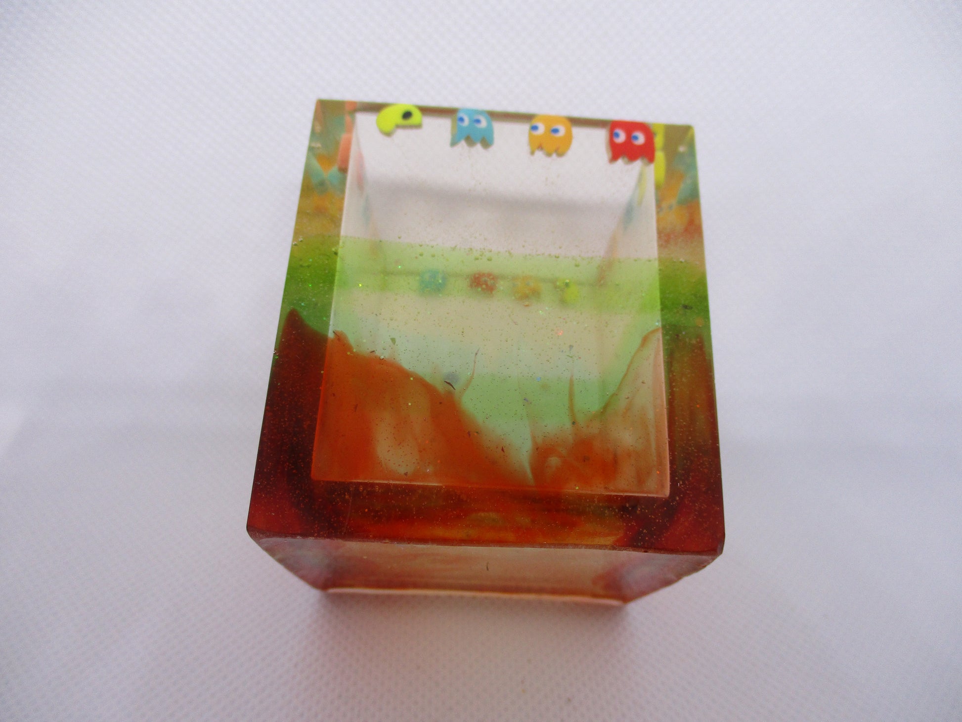 Each Pac Man container is lovingly handmade using premium two-part epoxy resin. The Pac Man and ghost inclusions are carefully positioned to recreate the classic chase scene, then encased in crystal-clear resin and cured for 48 hours to ensure a flawless, durable finish.